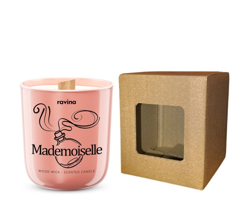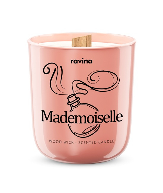 Oblíbená sójová svíčka Mademoiselle s dřevěným knotem. Obsahuje ekologický sójový vosk a doba hoření je výrazně delší než u parafínové svíčky. Jemné praskání dřevěného knotu navozuje relaxační romantickou atmosféru.